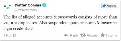 An anonymous hacker had published the laundry list of hacked accounts including Twitter usernames and passwords on five Pastebin entries.The social network said that 20,000 of the total number of compromised accounts were duplicates and invalid.
